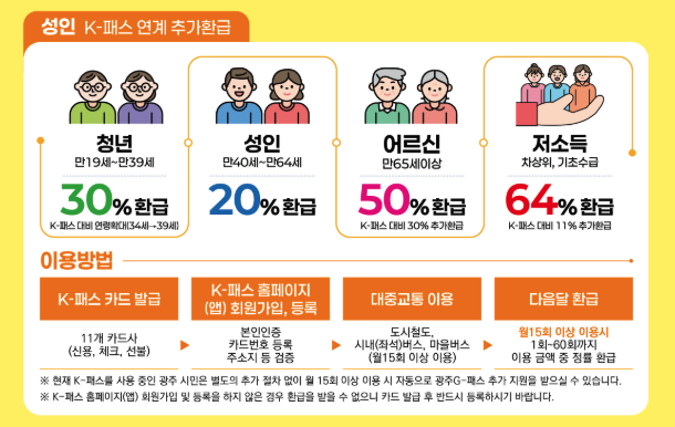 어르신(65세 이상)은 50% 할인, 저소득층(기초생활수급자, 차상위계층)은 64% 환급 혜택을 받습니다. 기존 K-패스 혜택과 광주G-패스 혜택을 합쳐 더 많은 지원을 받을 수 있어요.