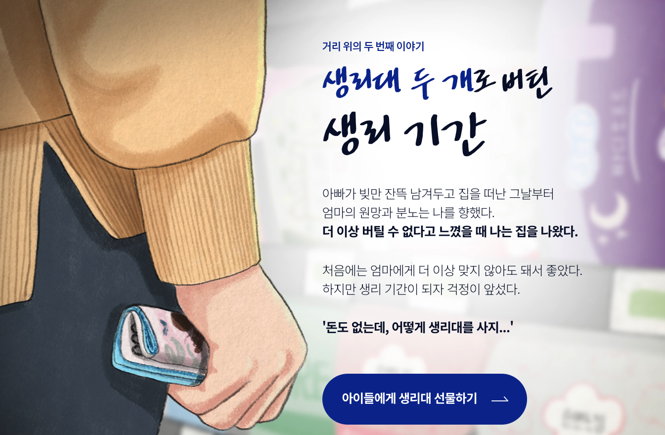 그래서 생리 기간 동안 학교를 가지 못하거나, 대인 관계를 회피하는 경우도 적지 않다고 해요. 이런 현실을 알고 나니, 생리 빈곤 문제를 더 이상 외면할 수 없겠더라고요.