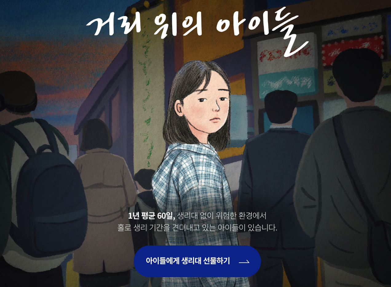 생리대가 없어 힘들어하는 아이들을 도와줄 기회가 있다면, 참여하지 않을 이유가 없겠죠? 아래 버튼을 통해 지금 바로 캠페인에 참여해보세요!