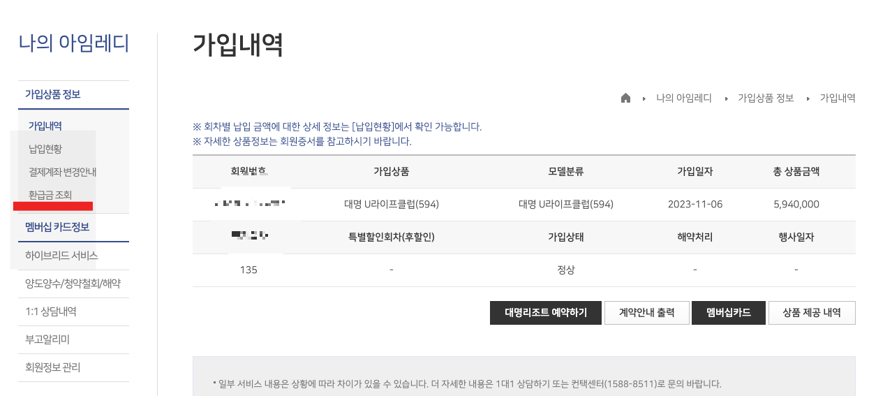 대명아임레디 홈페이지에 접속해 로그인한 뒤 "나의 아임레디" 메뉴에서 해약환급금을 조회했습니다.