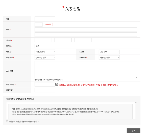 신청자 정보, 제품 정보, 고장 증상, 방문 희망 날짜 등을 입력하고 신청하세요.