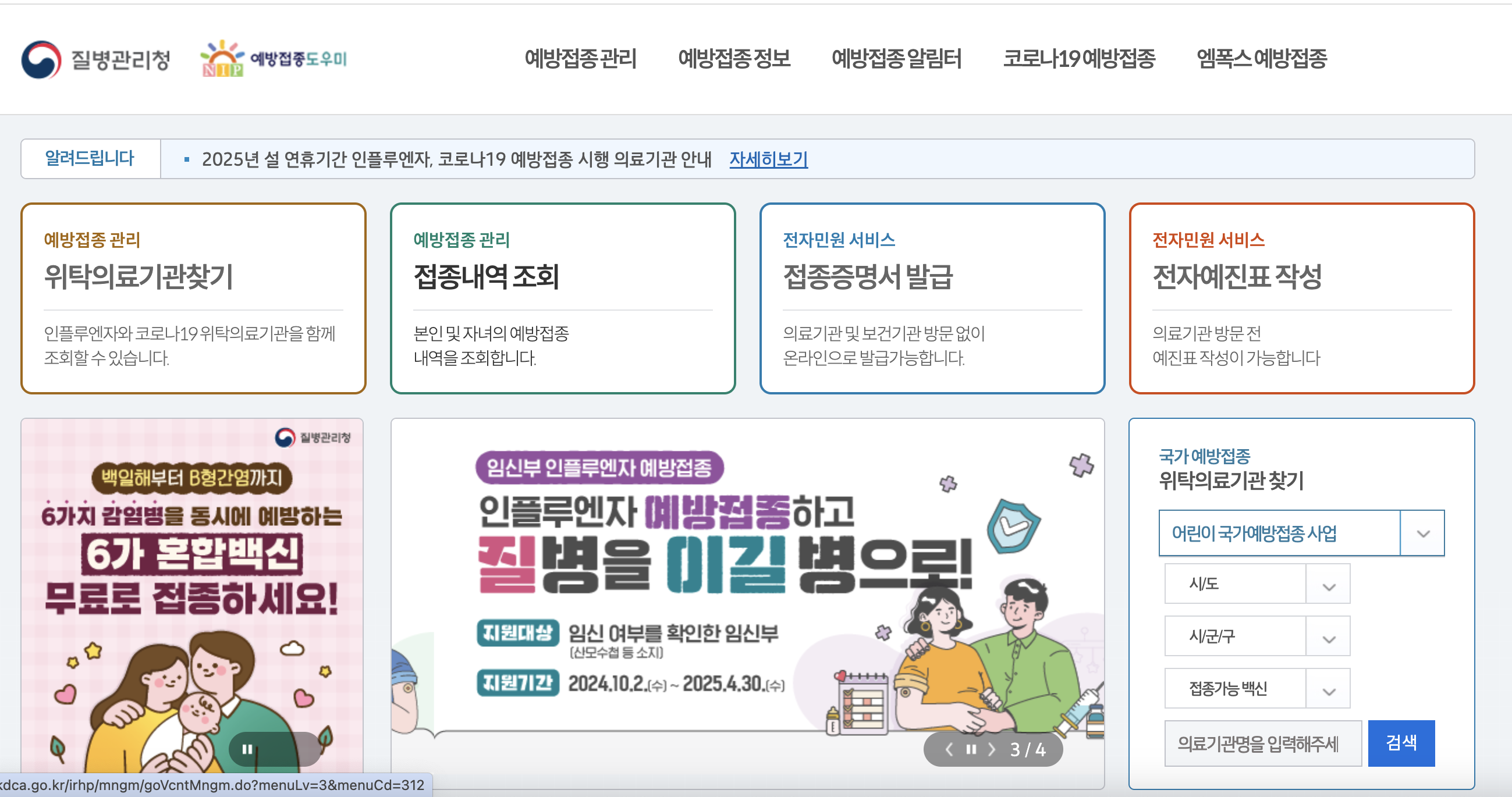 독감 예방접종을 받을 수 있는 병원은 예방접종도우미 누리집에서 확인할 수 있습니다.