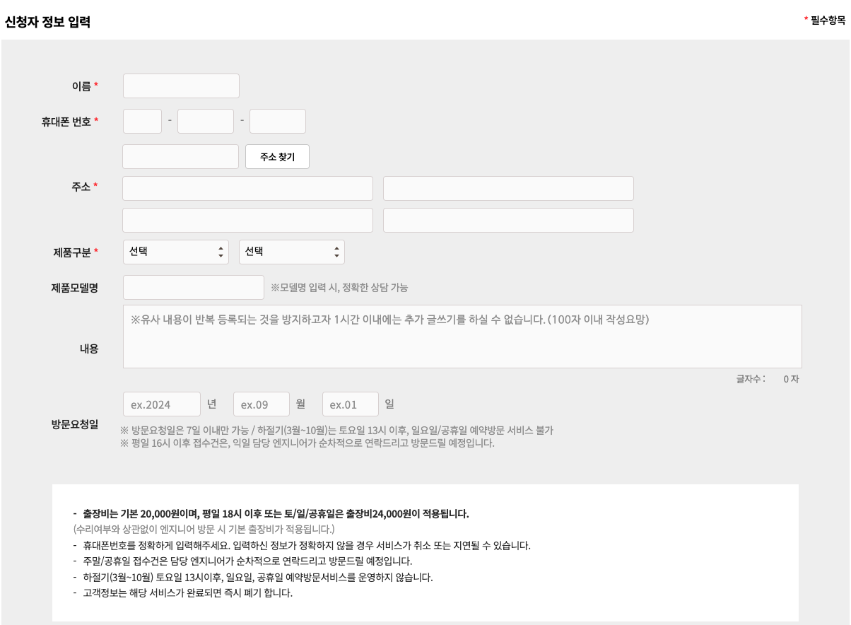 - 보일러 모델명, 보일러 고장 증상, 연락처, 주소, 희망 방문 시간을 입력하여 신청합니다.