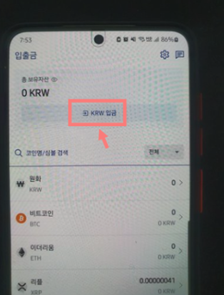 먼저 입출금 메뉴를 눌러서 KRW 입금을 선택해요.