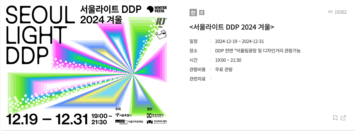 서울라이트 DDP 2024 겨울은 2024년 12월 19일(목)부터 12월 31일(화)까지 진행됩니다. 새해 맞이 카운트다운은 12월 31일(화) 23:00부터 시작됩니다.