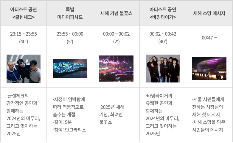 불꽃놀이와 함께 펼쳐지는 에너지 넘치는 아티스트 무대와 서울라이트의 환상적인 시각적 콘텐츠로 새해 첫날을 화려하게 장식하세요.
