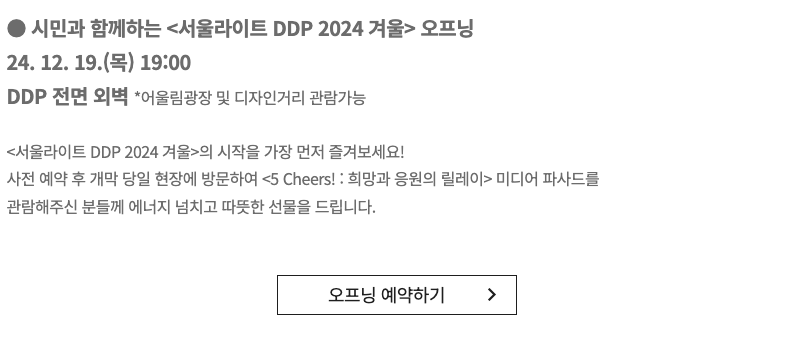 서울라이트 DDP 2024 겨울 오프닝이 곧 시작됩니다! 지금 바로 사전 예약하고, 오프닝과 새해 맞이 카운트다운에서만 만날 수 있는 특별한 선물을 받아보세요!