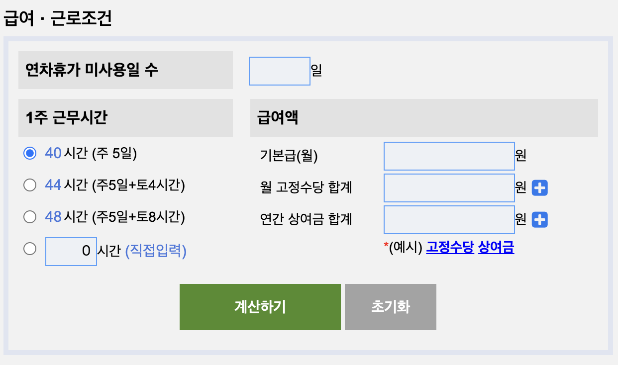 연차수당 계산기를 사용하면 이렇게 여러 가지 항목을 입력하고 계산할 수 있어요.