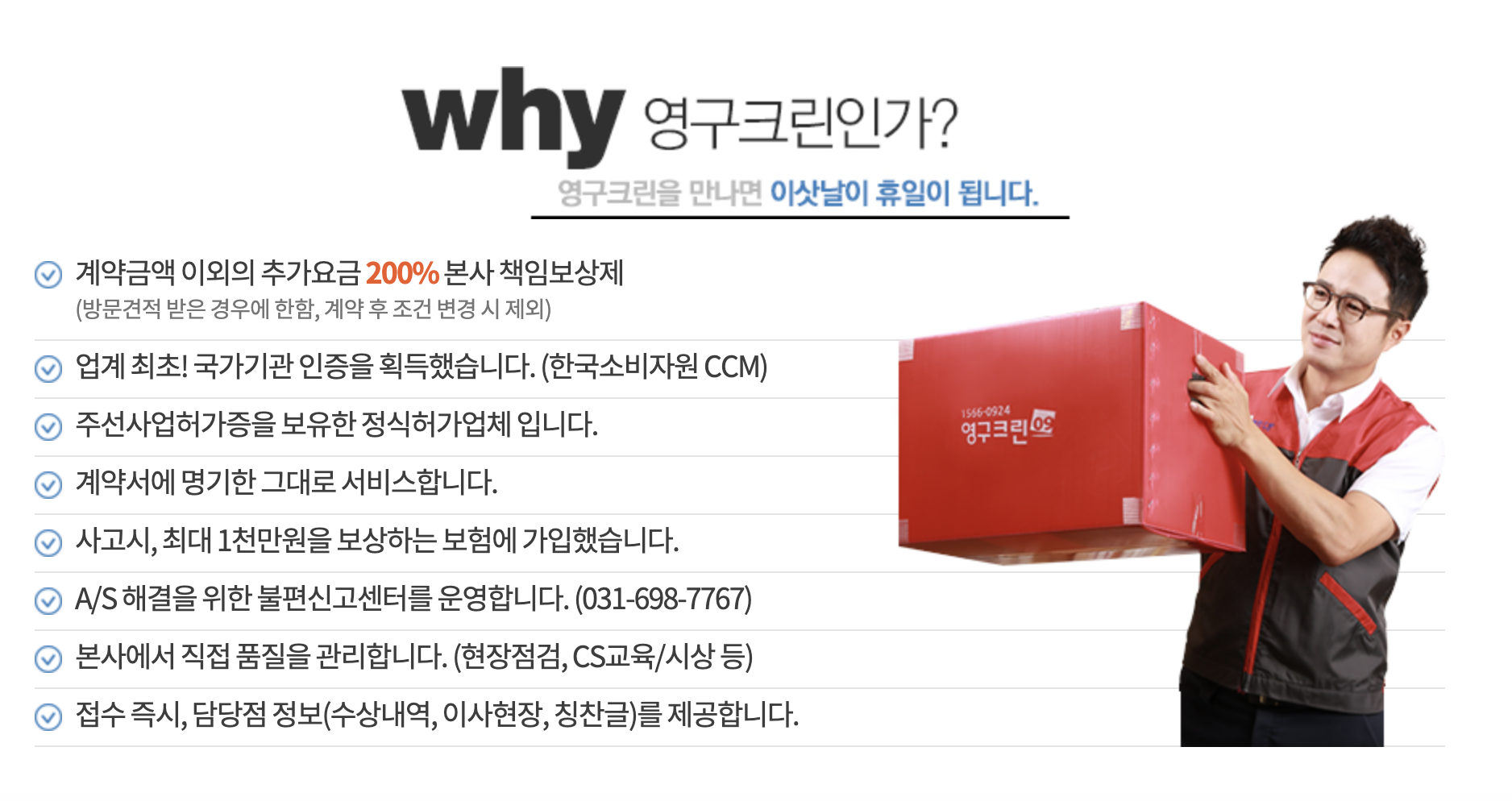 영구크린은 이사와 청소를 한 번에 해결할 수 있는 전문 브랜드입니다. 25년 이상의 풍부한 경험과 신뢰를 바탕으로 전국 어디서나 동일한 품질의 서비스를 제공합니다. 이삿짐 포장부터 운반, 청소까지 모든 과정을 안전하고 체계적으로 진행해 주기 때문에 믿음이 가더라고요.