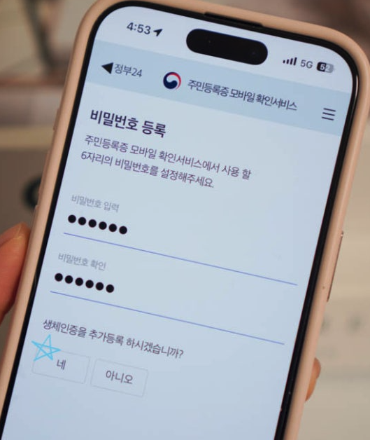 이제 6자리 비밀번호를 설정합니다. 이 비밀번호는 모바일 신분증을 불러오는 데 사용되므로 반드시 기억해두세요. 추가로 생체인증을 설정하면 더욱 편리하고 안전하게 사용할 수 있습니다.