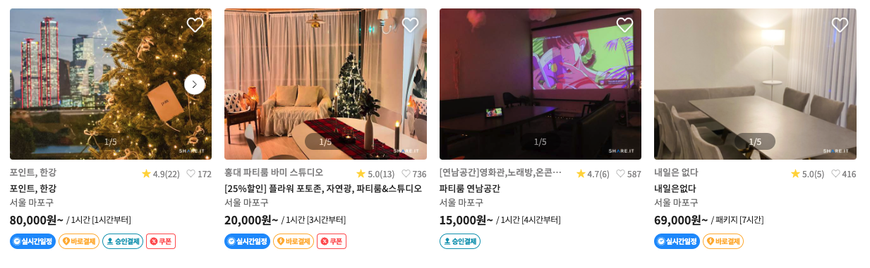 특히 쉐어잇은 사용자의 편리한 예약을 위해 다양한 필터와 검색 옵션을 제공하며, 다양한 가격대의 파티룸을 비교하고 선택할 수 있는 장점이 있습니다.