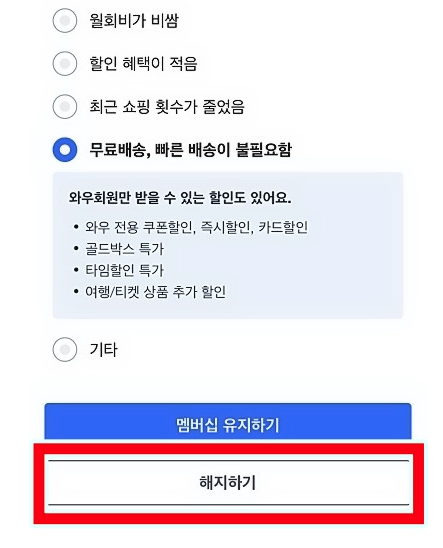 6. 해지 사유 선택: 해지 이유를 묻길래, '무료배송, 빠른 배송이 불필요함'을 선택했습니다. (사실 아무거나 누르셔도 됩니다)