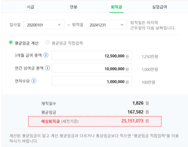 이 계산은 네이버 퇴직금 계산기에 입력해도 정확히 같은 결과가 나옵니다. 네이버 계산기를 사용하면 더 간편하겠죠?