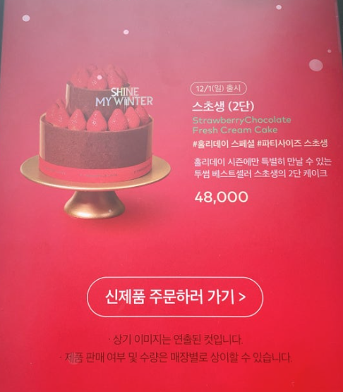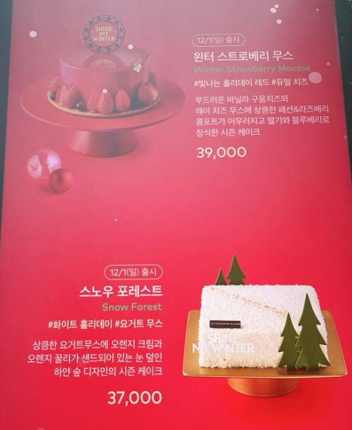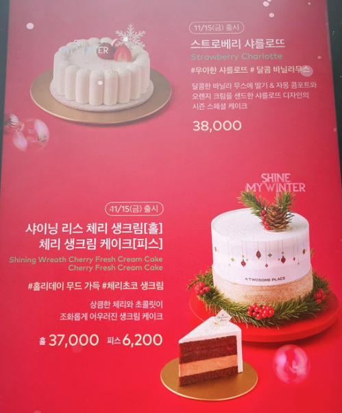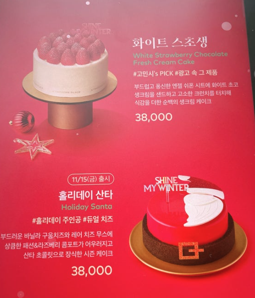 투썸플레이스의 2024 크리스마스 케이크는 세련된 디자인과 맛으로 손님들을 맞이합니다. 매장 내 쇼케이스에는 여러 종류의 홀케이크가 준비되어 있는데, 그 중 특히 눈에 띄는 화이트 스초생 케이크! 이외에도 다양한 케이크들이 준비되어 있으니, 어떤 케이크를 선택할지 미리 확인해보세요.