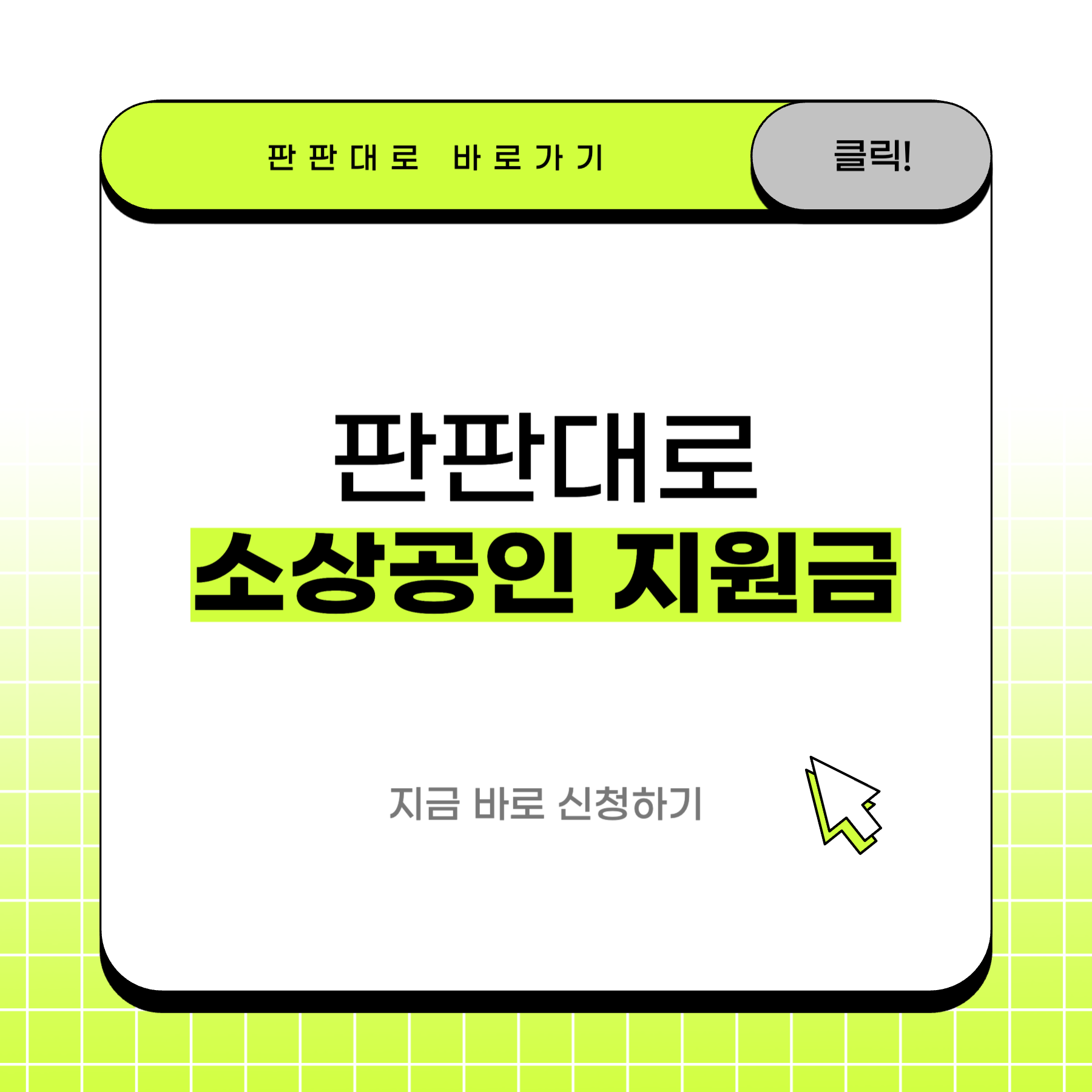 판판대로 소상공인 지원 사업 신청하셨나요? 예산 소진시 마감 예정이니 아래 버튼을 통해 지금 바로 신청하세요.