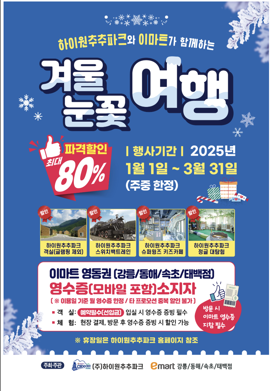 2025년 3월 31일까지 이마트 영동권(강릉/동해/속초/태백점) 영수증 소지자에게 하이원추추파크 객실, 스위치백 트레인, 키즈카페, 정글 대탐험 등 최대 80%까지 할인해준다고 하니 놓치지 마세요.
