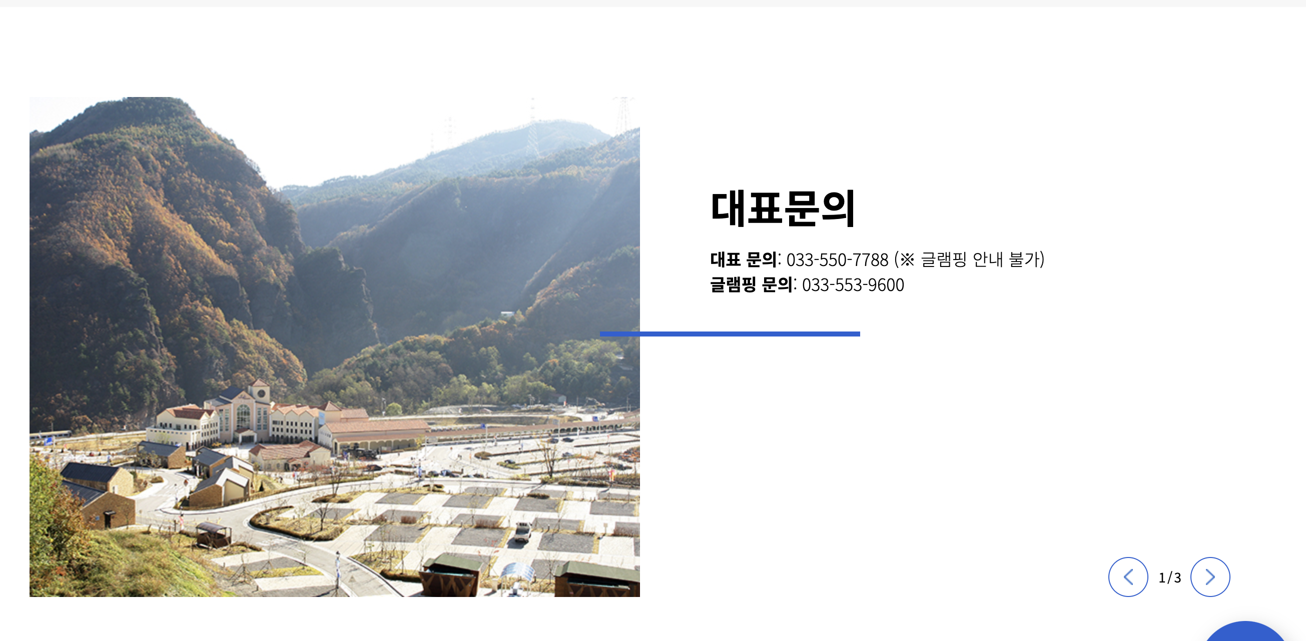 대표 전화번호는 033-550-7788이며 글램핑 문의는 033-553-9600으로 문의해보세요.