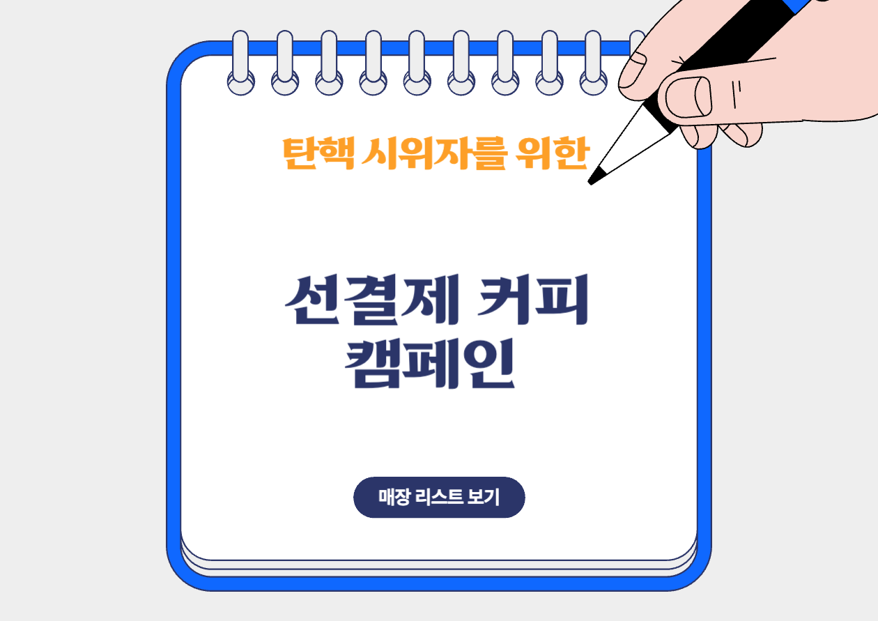 지금 바로 선결제 커피 캠페인 매장 리스트 확인하고 추운 날씨에 따뜻한 커피한잔 하며 지치지 않고 집회에 참여하시기 바랍니다.
