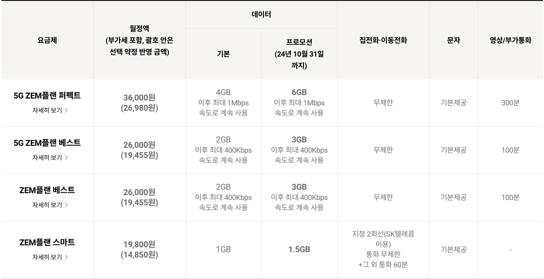 - 추천 요금제: SKT ZEM 플랜 스마트
